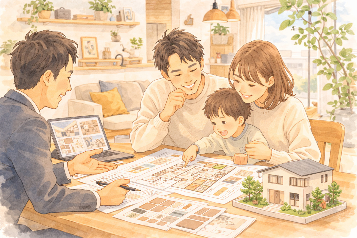 自由設計の家づくりは、 いきなり図面を決めることではありません。 まずは暮らし方や優先順位を整理しながら、 自分たちに合う住まいの形を見つけていくことが大切です。