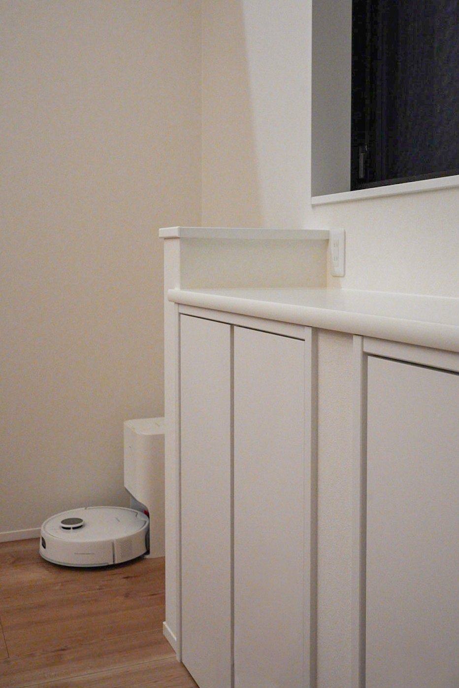 さらに印象的なのが、 階段下のデッドスペースを活用したロボット掃除機の基地です。 ただ収納するのではなく、 住まいの中で自然に収まりながら、必要なときにきちんと機能する場所として設計されています。