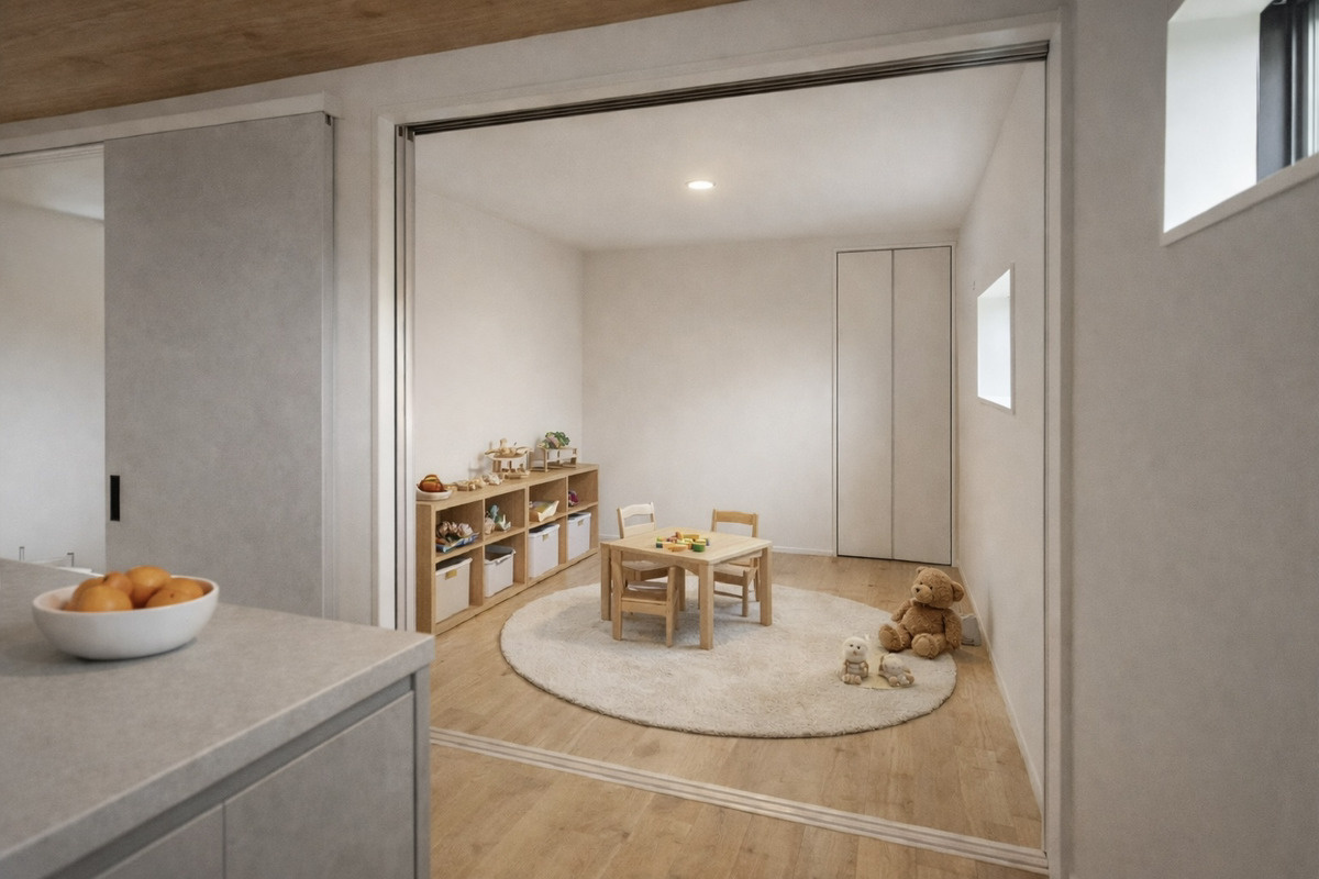 この住まいでは、家族の気配が自然につながることも大切にされています。 キッチンからは、お子さまのおもちゃ部屋の様子が見えるように計画されており、 家事をしながらでもお子さまの存在を感じられる安心感があります。